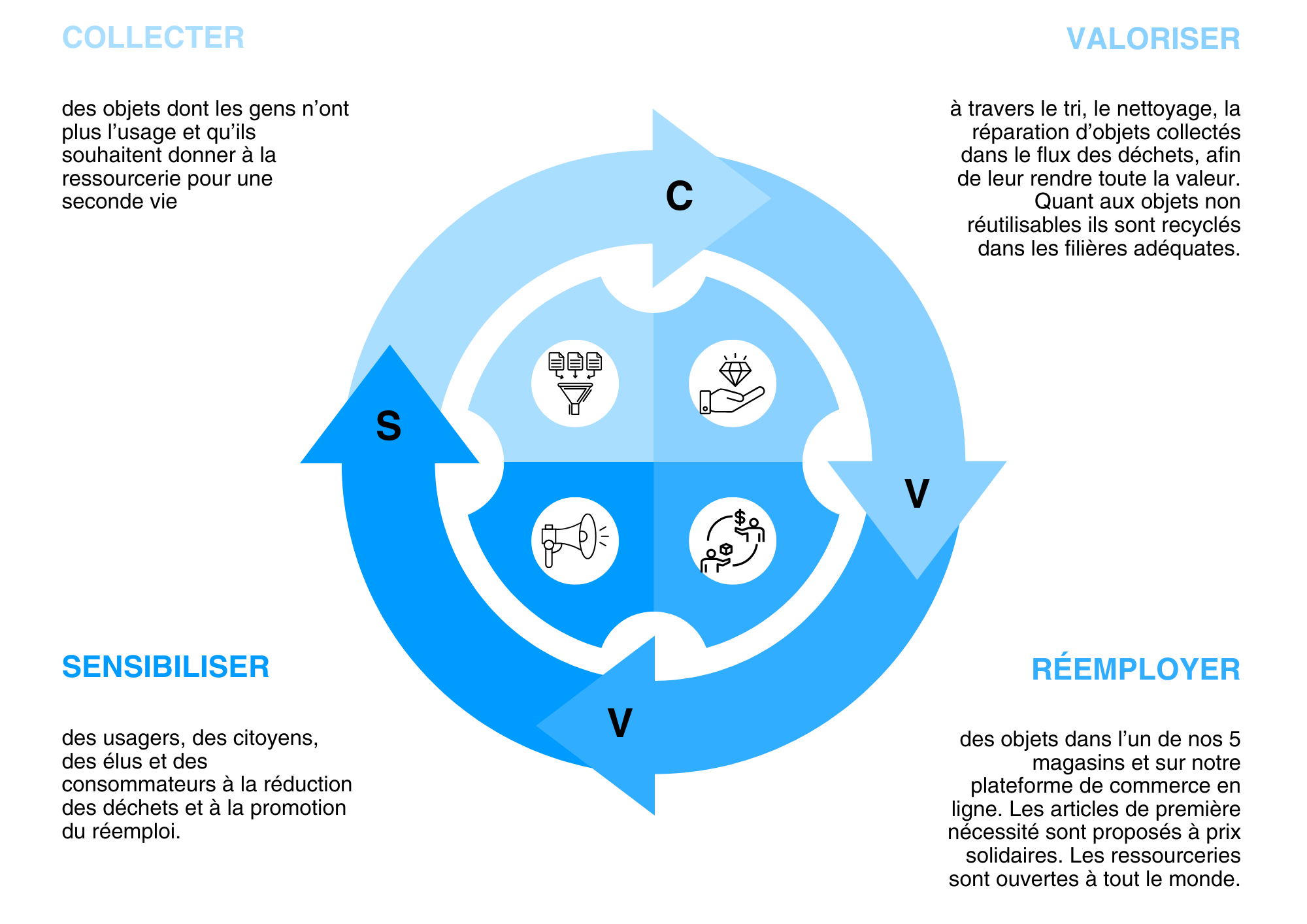 Tous ces objets sont valorisés, réparés, relookés dans nos ateliers afin d’être proposés à la vente à des prix solidaires dans l’une de nos 5 ressourceries et sur notre plateforme de commerce en ligne.